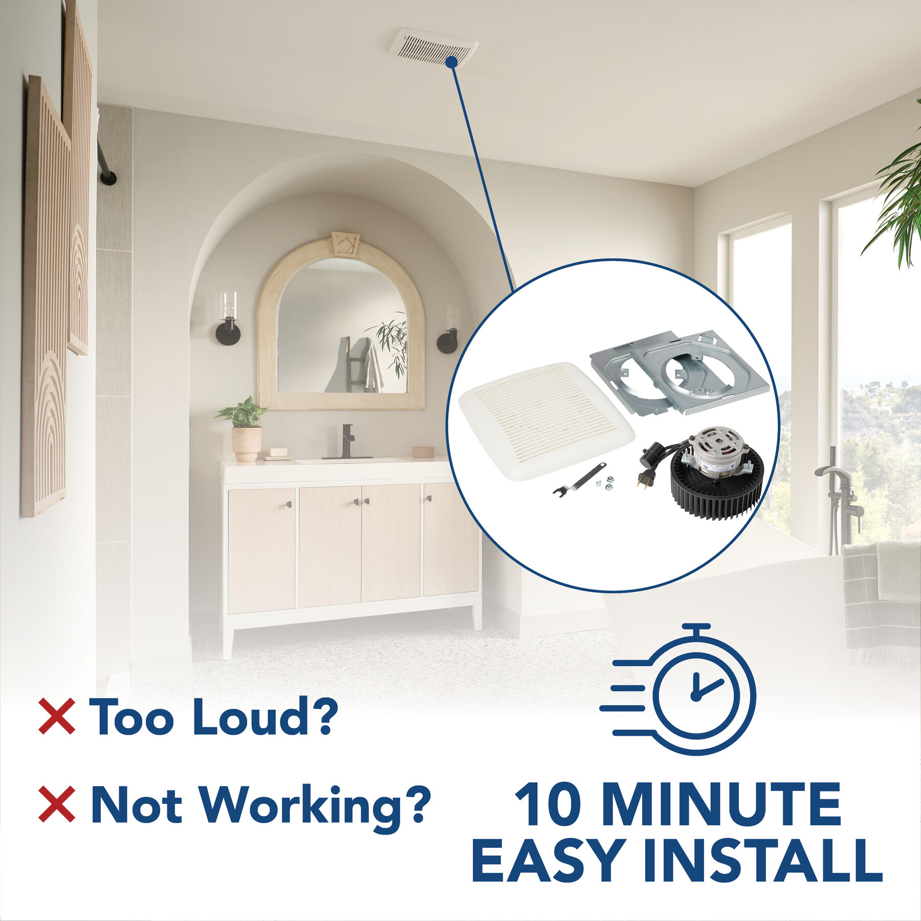 Refresh your bathroom in less than 10 minutes with the Broan-NuTone® QuicKit™, replacement motor and cover/grille. This is an easy DIY that does not require wiring, cutting or drywall repair. The QuicKit™ makes your bath fan up to 50% quieter and delivers up to 20% more power, keeping your air fresh and clean. The QuicKit is an easy, quick answer to a bathroom exhaust fan that is no longer working properly, is noisy or simply needs an upgrade. Included is a replacement cover/grille, pre-assembled motor and blower wheel, two motor mounting plates, scroll band, and hardware. This kit contains Genuine Broan-NuTone replacement parts, guaranteed to fit. All parts are designed, tested, and certified to ensure your product runs at peak performance.