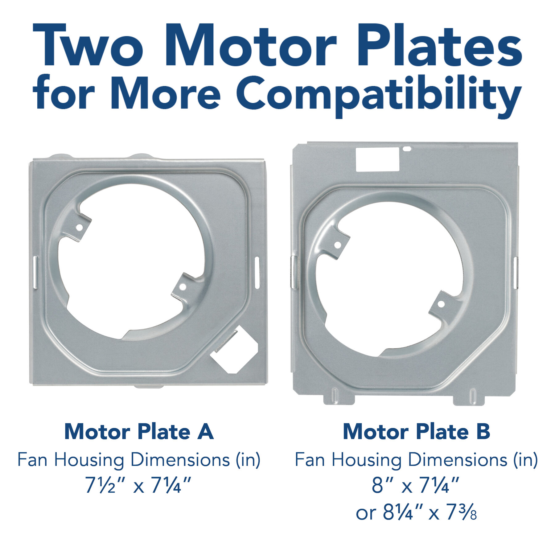- Compatible with Broan models 670, 671, 688, 689, EC50, ECF50, EC70, ECF70, ECH600, E050 and E070 with 7-1/2" x 7-1/4" fan housings or 8-1/16" x 7-3/8" housings - does not fit 8" x 8-1/4" housings