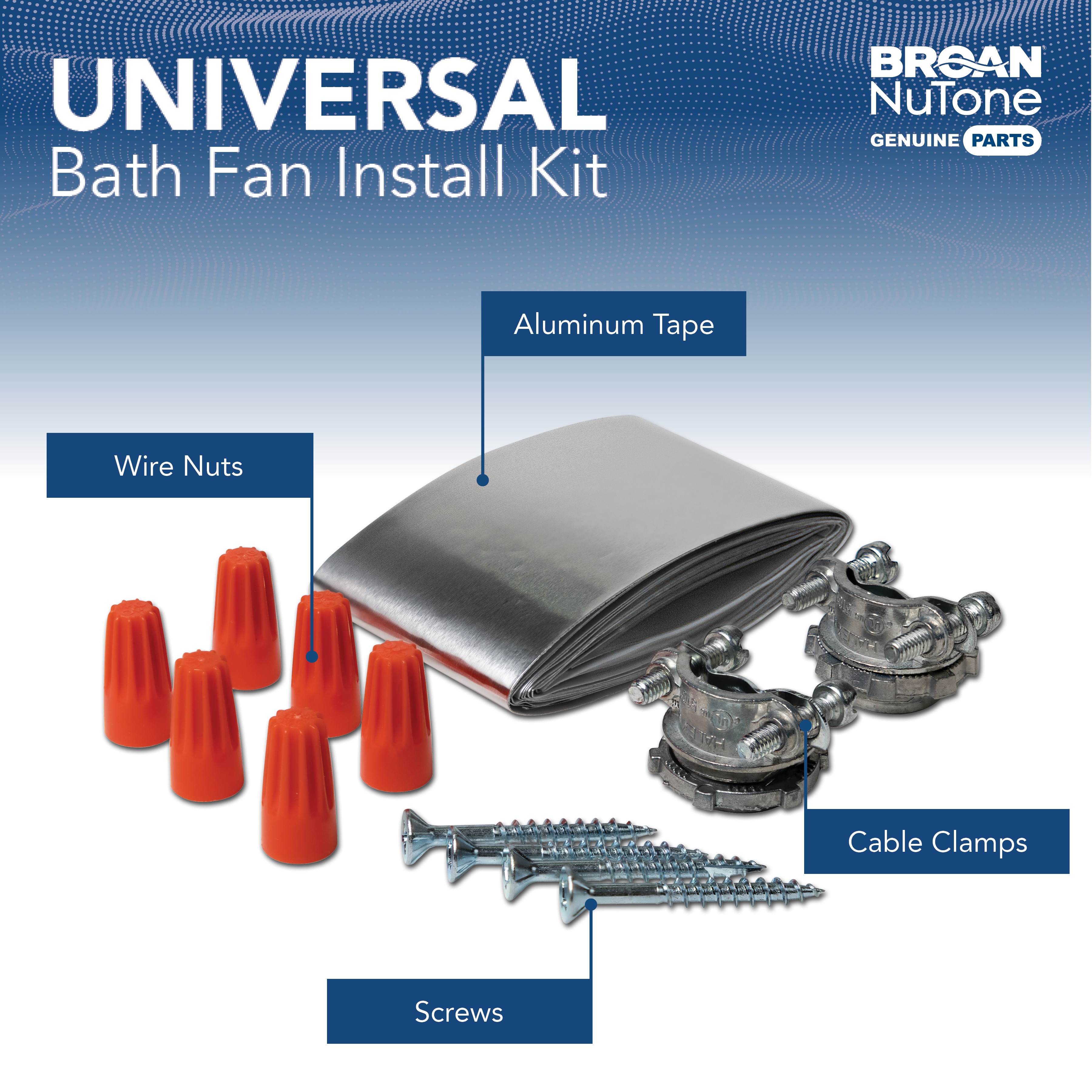 Install any bathroom fan quickly and confidently with this universal all‑in‑one bath fan installation kit. The compact kit includes only the highest quality materials, 5 ft aluminum HVAC tape, 6 wire nuts, 4 wood screws, and cable clamps. Everything needed for a safe, code‑ready bathroom exhaust fan install without extra store trips. Designed to work with any bath fan from any brand, it removes compatibility concerns and simplifies upgrades, replacements, and new installs. Some tougher housings may require a cordless driver for secure mounting. Perfect for DIYers and pros looking for an easy, reliable, universal solution.
