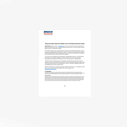 Broan-NuTone® Earns 2021 ENERGY STAR Sustained Excellence Award
