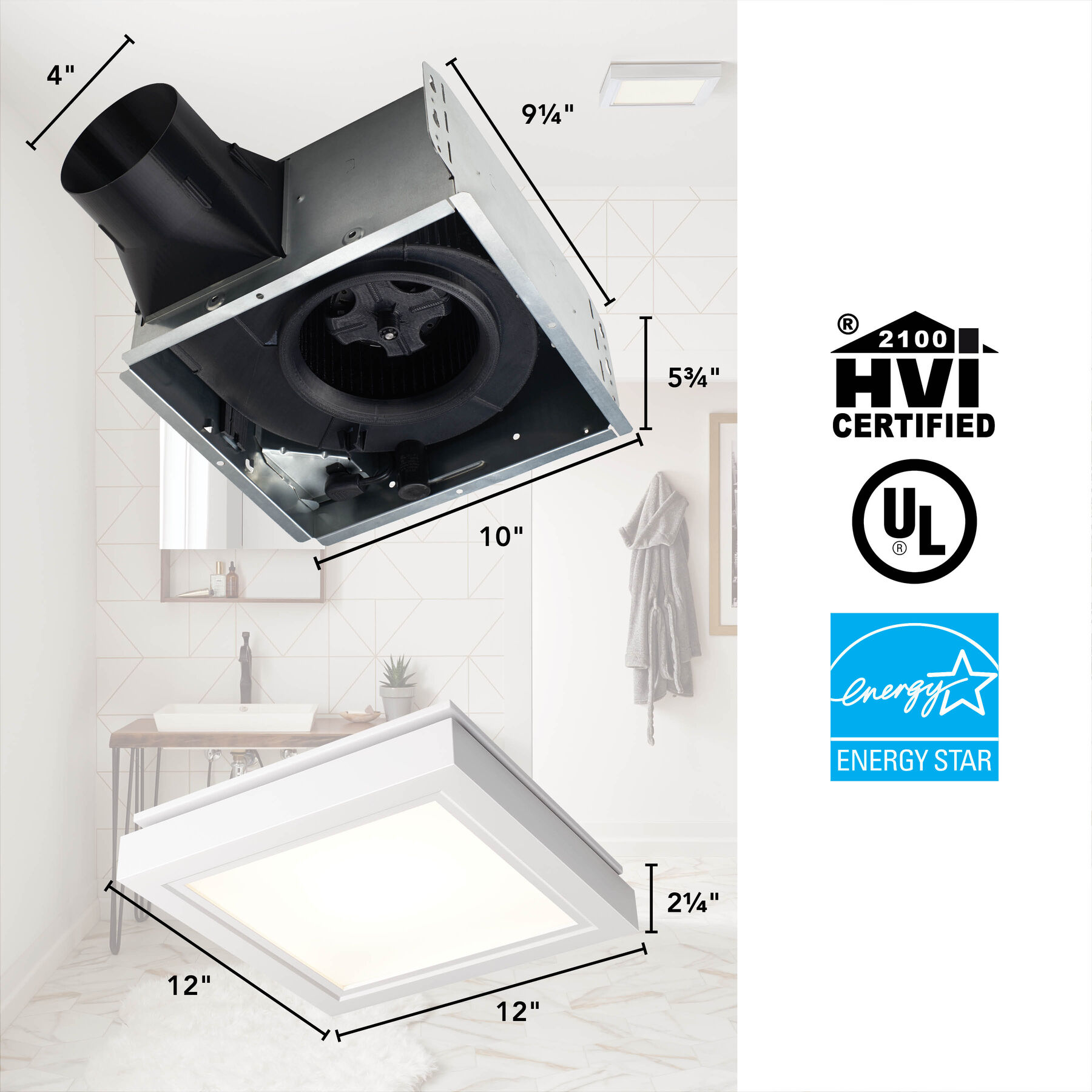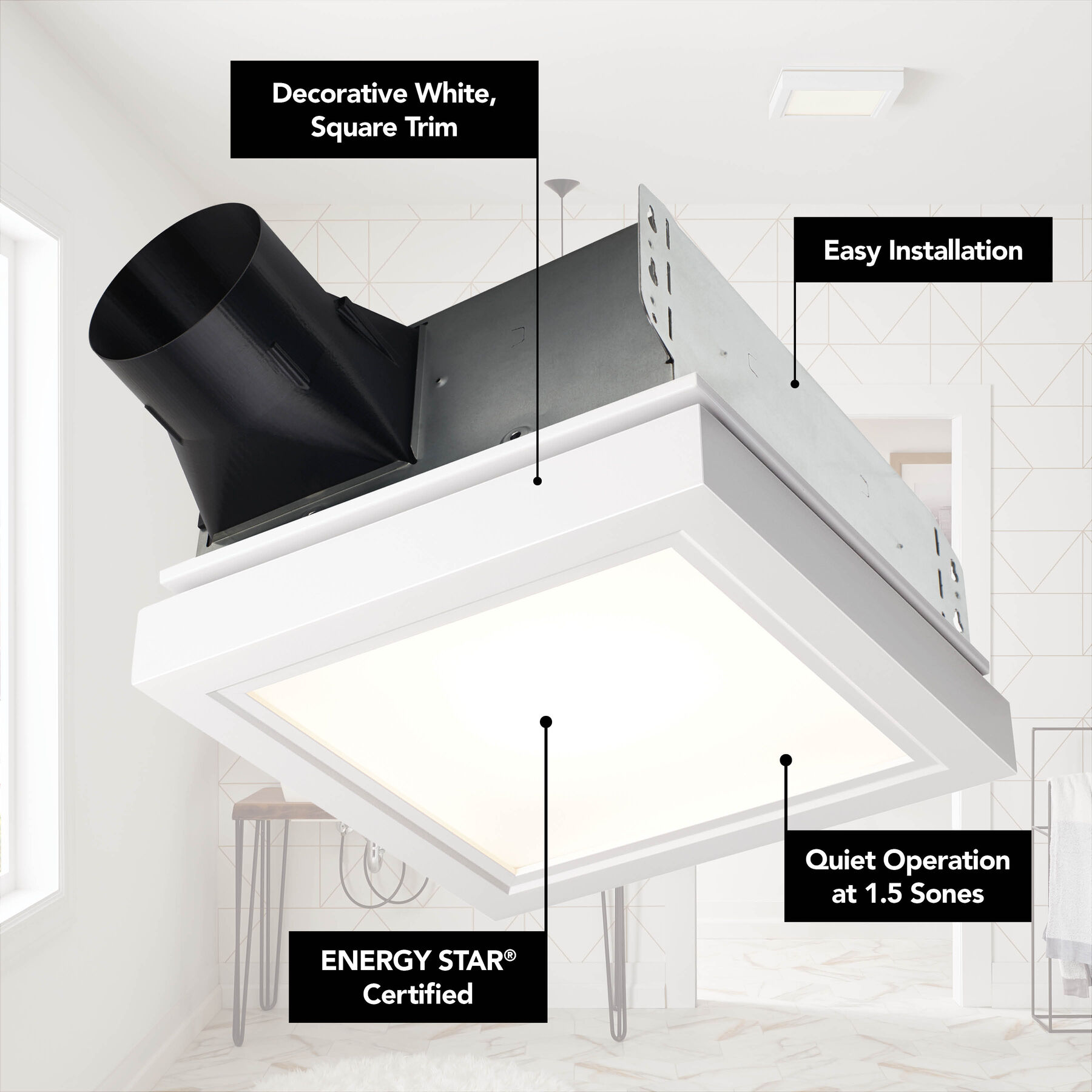 Broan NuTone® 110 CFM, 1.5 Sones Decorative Exhaust Fan with Square Flat Panel LED Light and White Trim allows you to upgrade or match the style of your bathroom or powder room. The Low-Profile LED panels are not only bright but also long-lasting for illumination where and when you need it. Powerfully efficient ventilation works quietly to keep your space free from odor and humidity in a modern, elegant design. With Roomside installation, no attic access is required, providing you with a faster and easier installation.