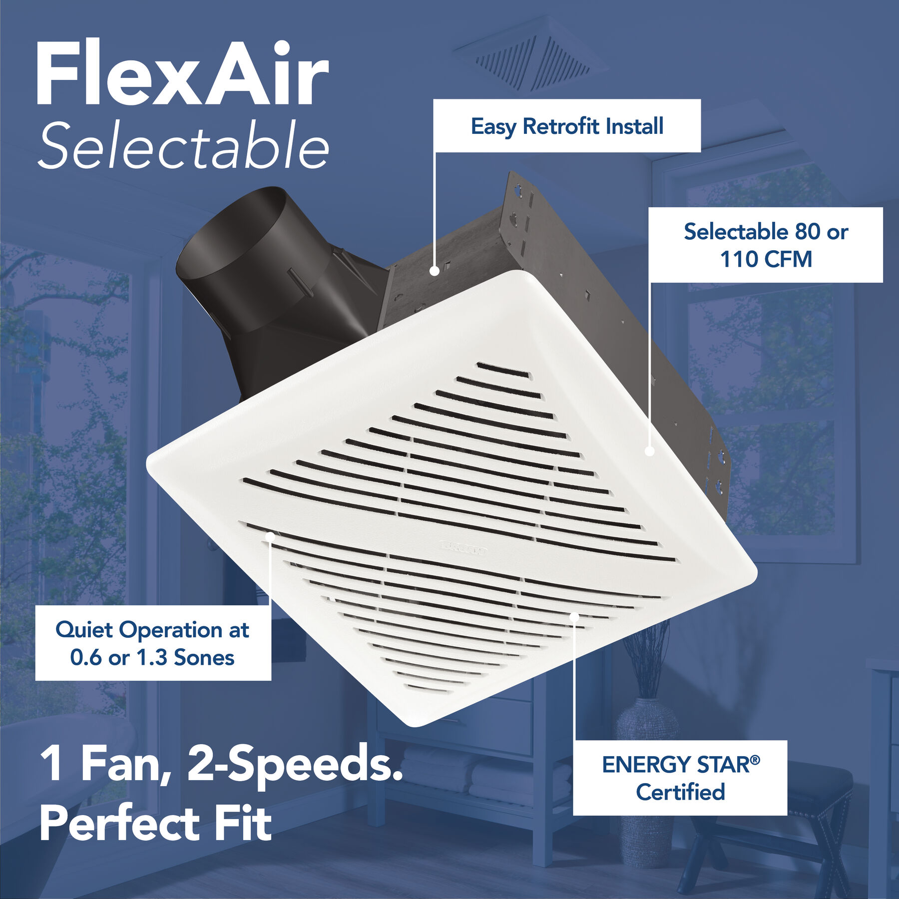 Experience powerful, quiet ventilation with the FlexAir Selectable Bathroom Exhaust Fan, designed for performance and convenience. Featuring a room-side installation design, there’s no need for attic access—making it an ideal solution for retrofit projects. This fan offers the flexibility of two speeds—80 or 110 CFM—to match your bathroom’s airflow needs with a simple flip of the switch on the housing. It’s also ENERGY STAR® certified, ensuring efficient operation that saves energy without compromising performance. Installation is quick and hassle-free thanks to foldable mounting ears and the EzDuct™ connector. Enjoy smooth, quiet operation at just 0.6 or 1.3 sones, delivering comfort without the noise. From Broan-NuTone, the leader in residential indoor air quality and trusted in over 110 million homes, FlexAir Selectable truly lives up to its promise: 1 Fan, 2-Speeds. Perfect Fit.